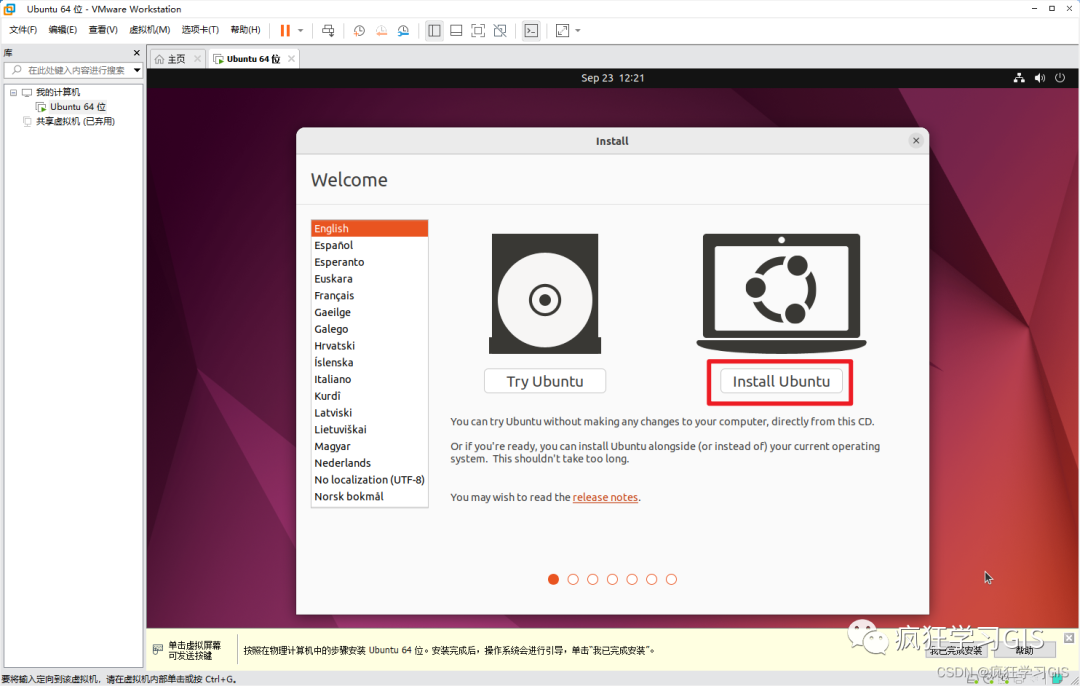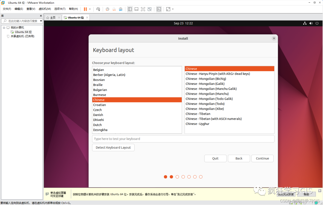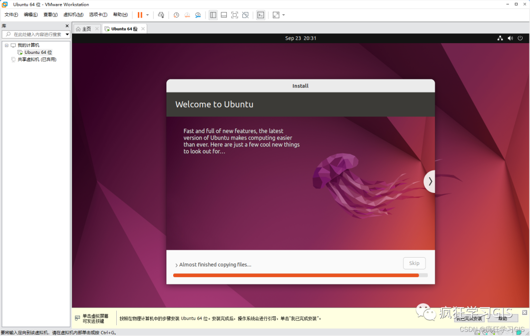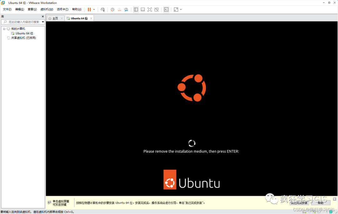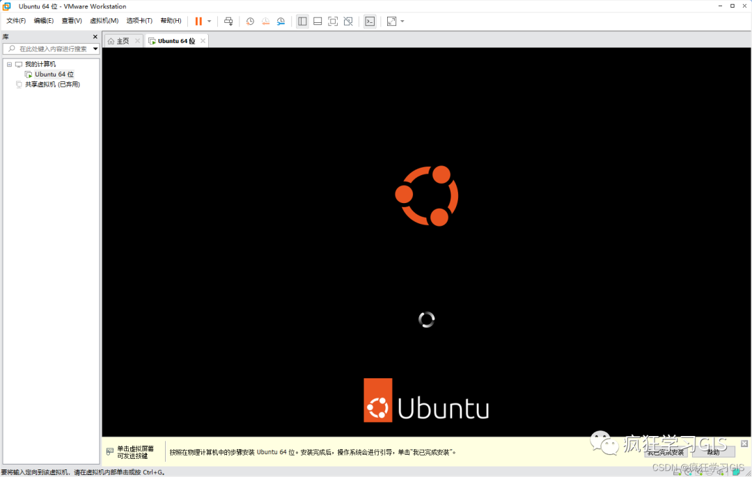 这里需要注意一点,如果大家此时发现自己的虚拟机不能用小键盘,可以参考本文最后一部分内容来设置;我们这里还是先继续Linux Ubuntu操作系统的安装。完成前述全部配置后,即可开始Linux Ubuntu操作系统的安装;这一安装步骤大概需要十几分钟。