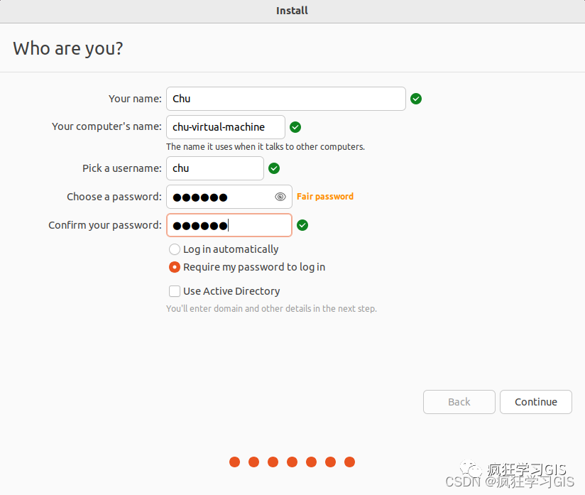 接下来,我们选择我们所在的地理位置,并设置虚拟机Linux Ubuntu操作系统的账户名称、电脑名称与账户密码等。