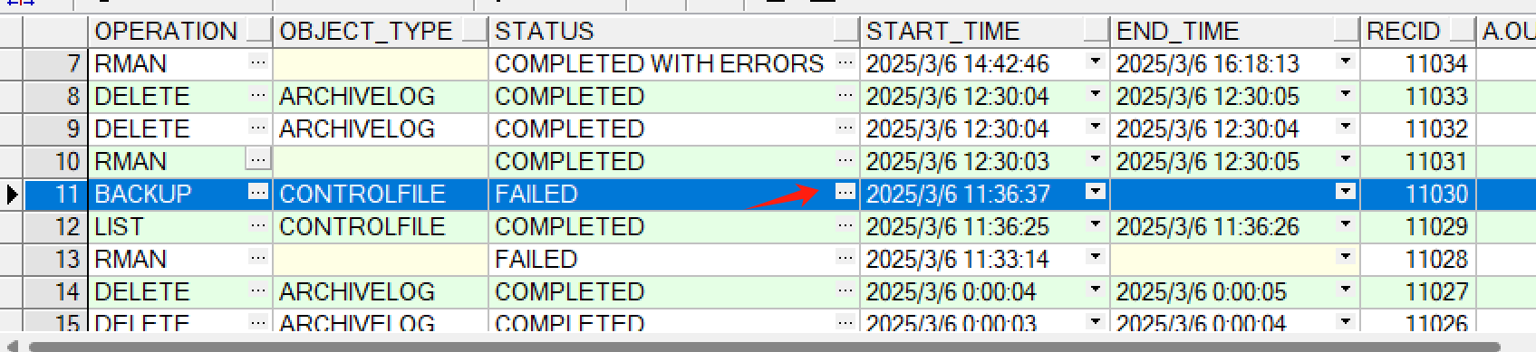 1.查询rman备份情况,11点36发起的备份没有结束时间,状态备份失败。