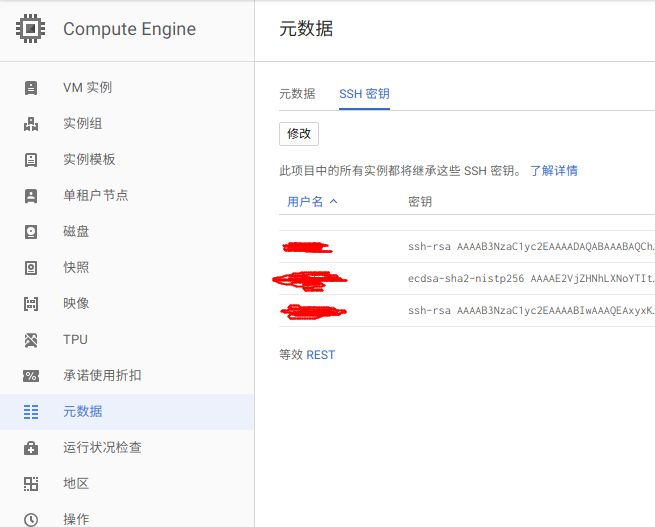 当然也可以使用图形化操作界面,毕竟更习惯图形化界面的操作,先登录谷歌云找到自己的服务器,然后在元数据这里,如下图: