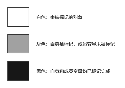 采用三色标记法进行标记,三色标记法在原有双色标记(黑也就是 1 代表存活,白 0 代表可回收)增加了一种灰色。