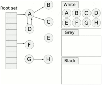 GC 开始前所有对象都是白色,GC 一开始所有根能够直达的对象被压到栈中,待搜索,此时颜色是灰色。