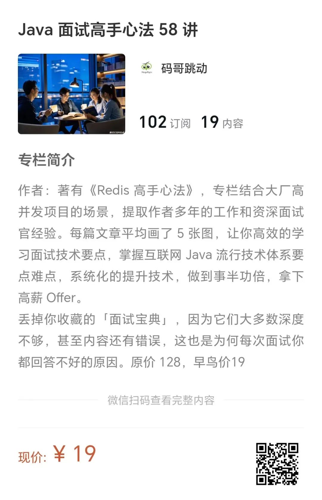 介绍下我的《Java 面试高手心法 58 讲》专栏内容涵盖 Java 基础、Java 高级进阶、Redis、MySQL、消息中间件、微服务架构设计等面试必考点、面试高频点。