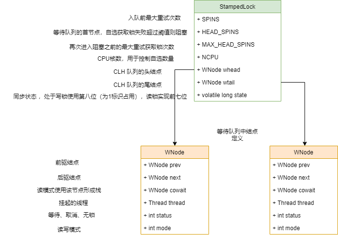 队列的节点通过 WNode 定义,如上图所示。等待队列的节点相比 AQS 更简单,只有三种状态分别是: