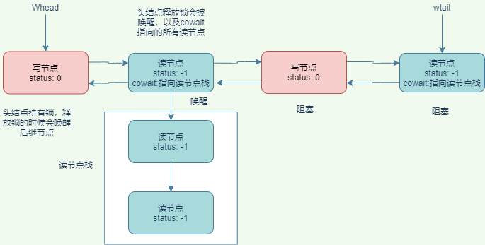 唤醒的节点是读节点的时候,会唤醒此读节点的 cowait 锁指向的栈的所有读节点,但是唤醒与插入的顺序相反。