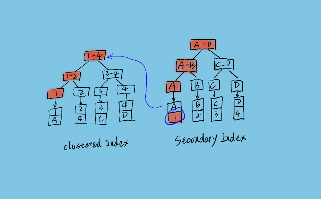 如果通过普通查询数据,流程如图所示,先从普通索引树上搜索到主键,然后在聚簇索引上通过主键搜索到数据行。