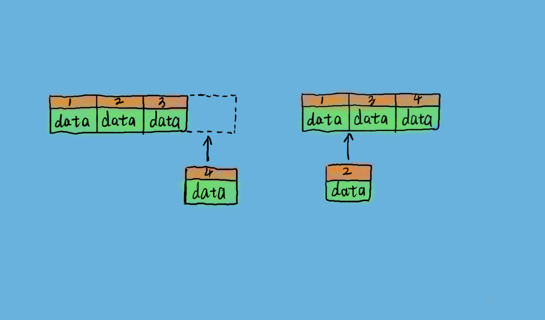由于每次插入时也不需要移动已有数据,因此效率很高,也不会增加很多开销在维护索引上,如下图所示。