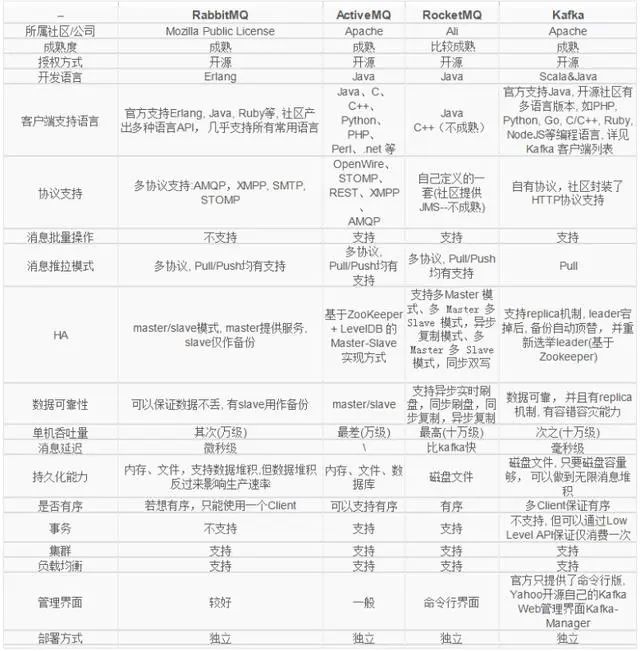 下面是常见的几种分布式消息系统的对比: