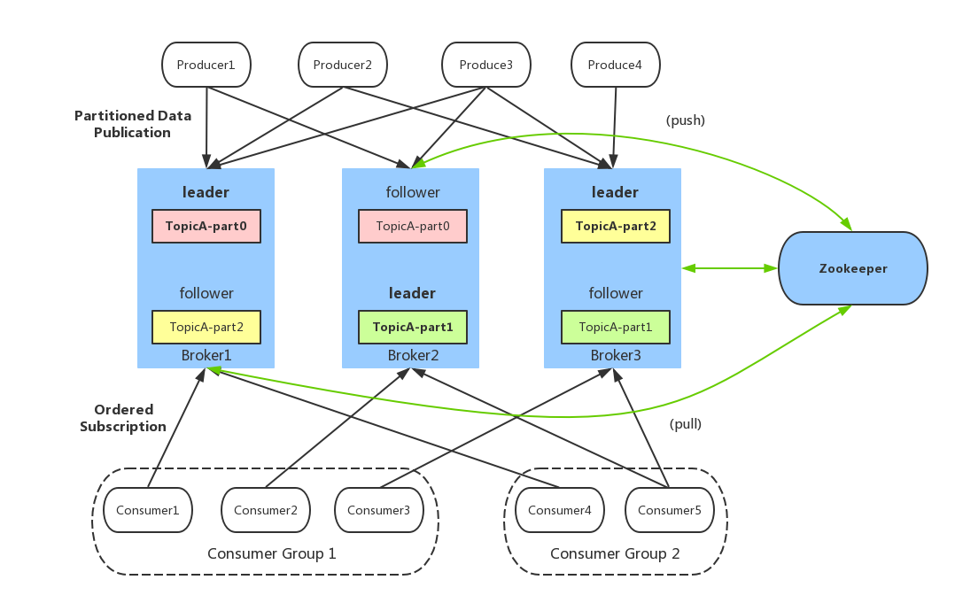 在分布式数据系统中,通常使用分区来提高系统的处理能力,通过副本来保证数据的高可用性。多分区意味着并发处理的能力,这多个副本中,只有一个是 leader,而其他的都是 follower 副本。仅有 leader 副本可以对外提供服务。多个 follower 副本通常存放在和 leader 副本不同的 broker 中。通过这样的机制实现了高可用,当某台机器挂掉后,其他 follower 副本也能迅速”转正“,开始对外提供服务。