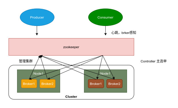 Broker 注册:Broker 是分布式部署并且之间相互独立,Zookeeper 用来管理注册到集群的所有 Broker 节点。 Topic 注册:在 Kafka 中,同一个 Topic 的消息会被分成多个分区并将其分布在多个 Broker 上,这些分区信息及与 Broker 的对应关系也都是由 Zookeeper 在维护 生产者负载均衡:由于同一个 Topic 消息会被分区并将其分布在多个 Broker 上,因此,生产者需要将消息合理地发送到这些分布式的 Broker 上。 消费者负载均衡:与生产者类似,Kafka 中的消费者同样需要进行负载均衡来实现多个消费者合理地从对应的 Broker 服务器上接收消息,每个消费者分组包含若干消费者,每条消息都只会发送给分组中的一个消费者,不同的消费者分组消费自己特定的 Topic 下面的消息,互不干扰。