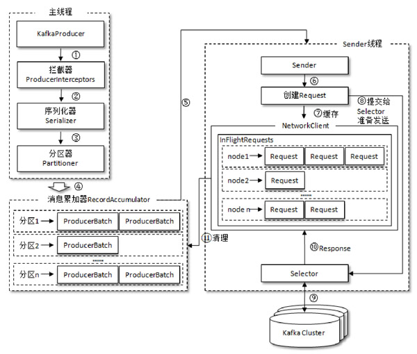 Producer 发送消息的过程如下图所示,需要经过拦截器