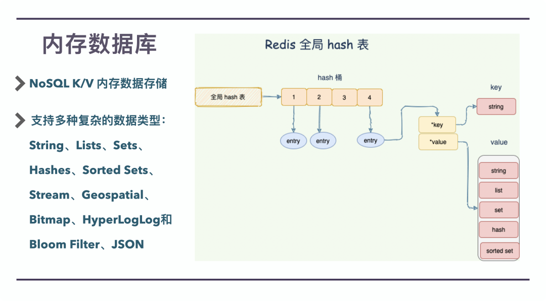 它支持复杂的数据类型(例如 String、Hashes、Lists、sets, sorted sets, 和 JSON),并在这些数据类型的命令操作都具备原子性。