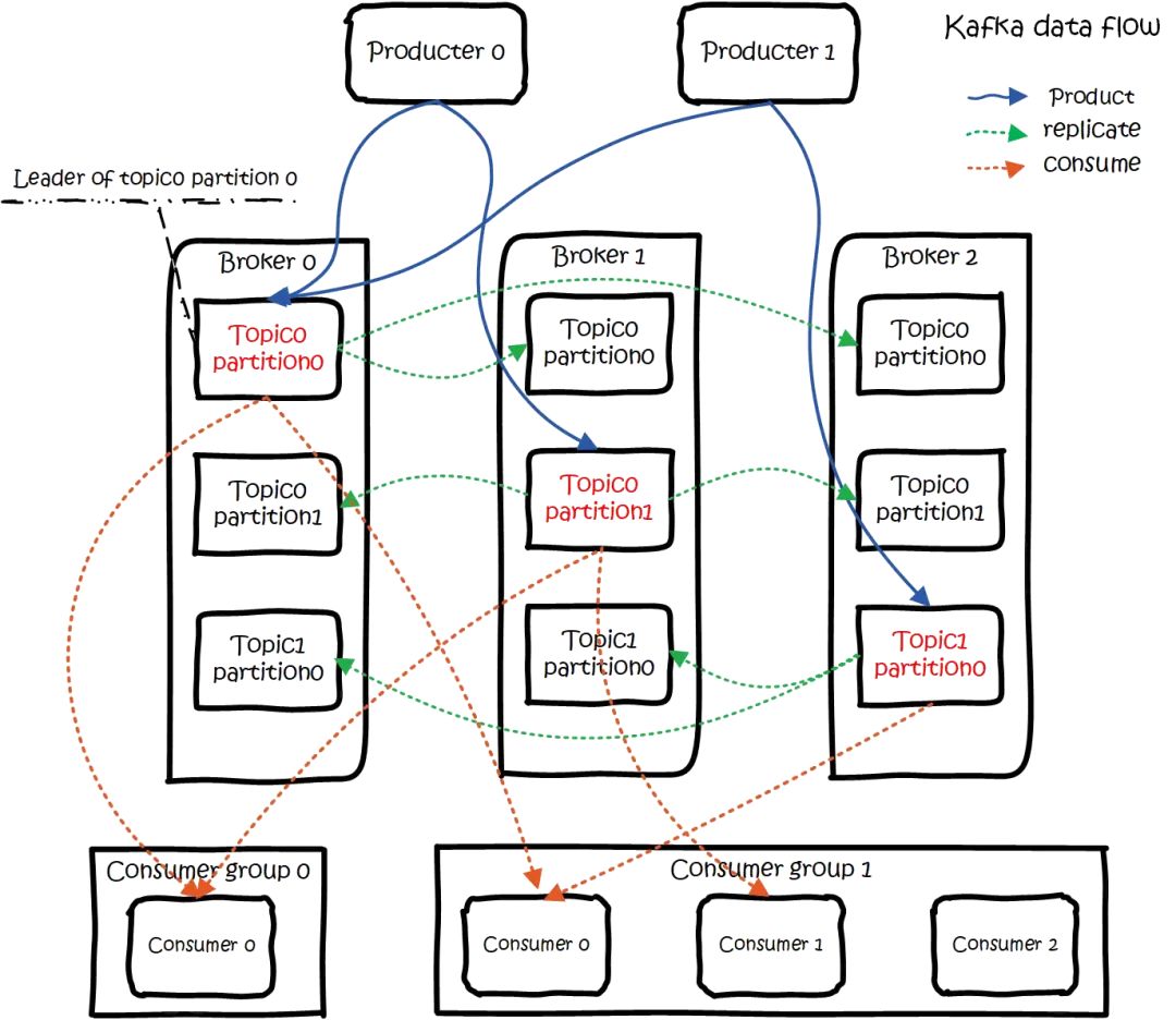 大概用法就是,Producers往Brokers里面的指定Topic中写消息,Consumers从Brokers里面拉去指定Topic的消息,然后进行业务处理。图中有两个topic,topic 0有两个partition,topic 1有一个partition,三副本备份。可以看到consumer gourp 1中的consumer 2没有分到partition处理,这是有可能出现的,下面会讲到。