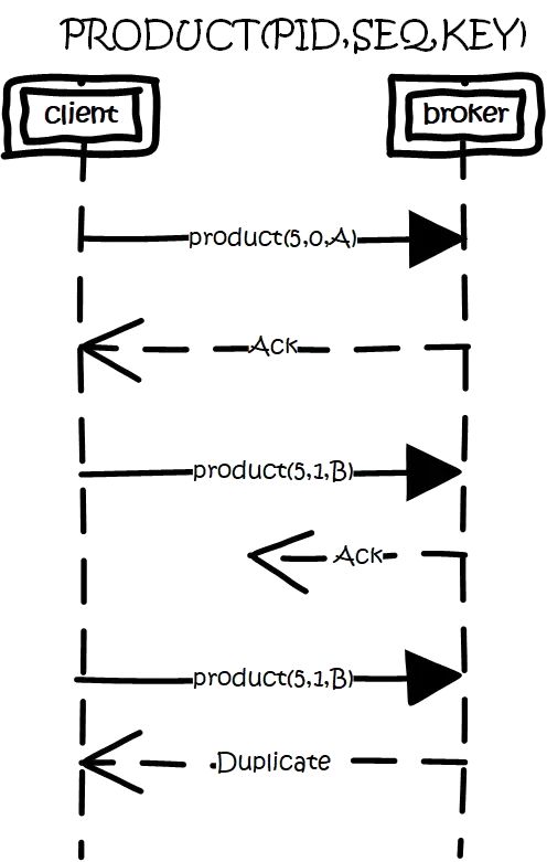思路是这样的,为每个producer分配一个pid,作为该producer的唯一标识。producer会为每一个<topic,partition>维护一个单调递增的seq。类似的,broker也会为每个<pid,topic,partition>记录下最新的seq。当req_seq == broker_seq+1时,broker才会接受该消息。因为: