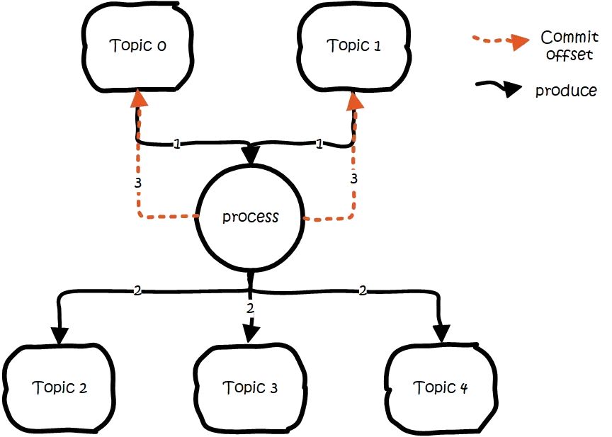 先从多个源topic中获取数据。 做业务处理,写到下游的多个目的topic。 更新多个源topic的offset。
