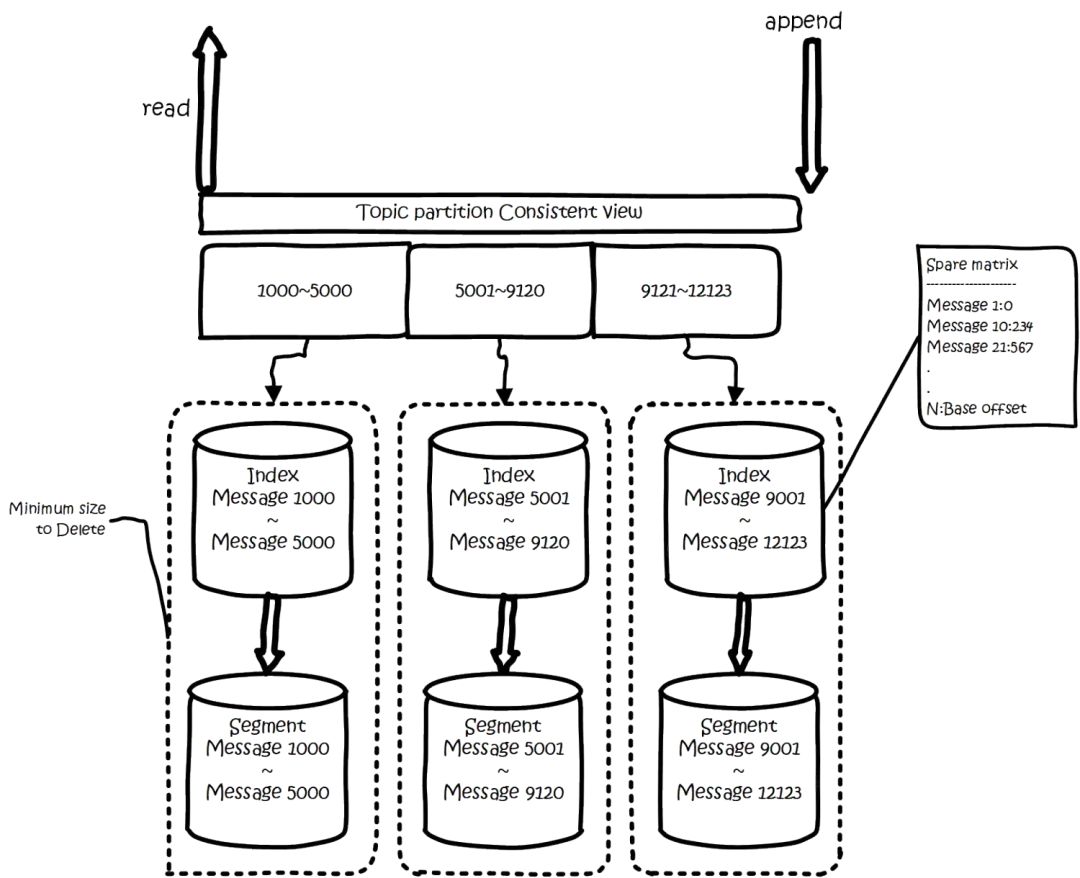 为了减少索引文件的大小,降低空间使用,方便直接加载进内存中,这里的索引使用稀疏矩阵,不会每一个message都记录下具体位置,而是每隔一定的字节数,再建立一条索引。索引包含两部分,分别是baseOffset,还有position。