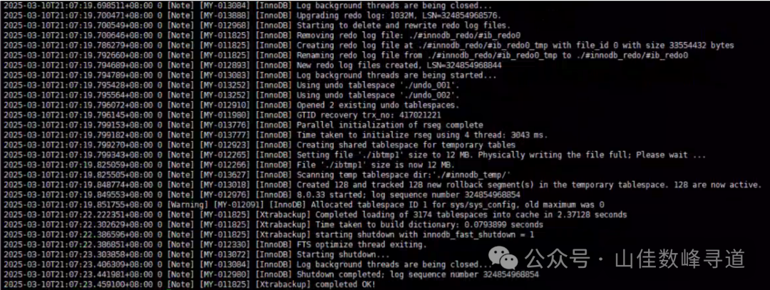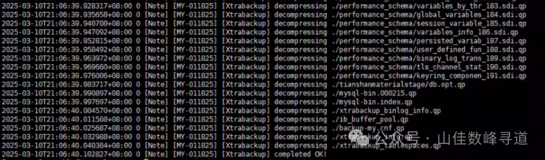 2025-03-10T20:49:15.107782+08:00 0 [Note] [MY-011825] [Xtrabackup] recognized server arguments: --datadir=/data/mysql/data --server-id=100 --open_files_limit=65535 --innodb_file_per_table=1 --log_bin=/data/mysql/data/mysql-bin --innodb_log_files_in_group=5 --innodb_log_group_home_dir=/data/mysql/data --innodb_undo_directory=/data/mysql/data --innodb_buffer_pool_size=16455346892 --innodb_log_file_size=1G --innodb_log_buffer_size=100M2025-03-10T20:49:15.107925+08:00 0 [Note] [MY-011825] [Xtrabackup] recognized client arguments: --socket=/data/mysql/data/mysql.sock --decompress=1 --target-dir=/data/backup/data/soft/percona-xtrabackup/bin/xtrabackup version 8.0.33-28 based on MySQL server 8.0.33 Linux (x86_64) (revision id: b3a3c3dd)2025-03-10T20:49:15.108676+08:00 0 [Note] [MY-011825] [Xtrabackup] decompressing ./xtrabackup_logfile.qpsh: 1: qpress: not foundcat: write error: Broken pipe2025-03-10T20:49:15.216597+08:00 0 [ERROR] [MY-011825] [Xtrabackup] decrypt and decompress thread 0 failed.