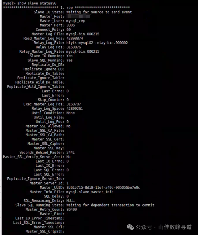 reset master;change master tomaster_host='主库IP',master_port=3306,master_user='mysql_rep',master_password='lq****4N',master_log_file='mysql-bin.000215',master_log_pos=157;