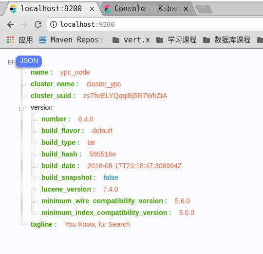 然后重新在浏览器输入:localhost:9200,就会看到我们的cluter和node名称都已经修改成我自己定义的了