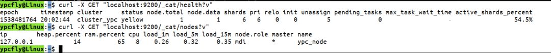 注意,GET、PUT、DELETE等等这些REST API的操作必须要大写,还有就是curl可能需要自己安装。然后我们就看到控制台给出的响应信息。然后是查看节点的健康状态: