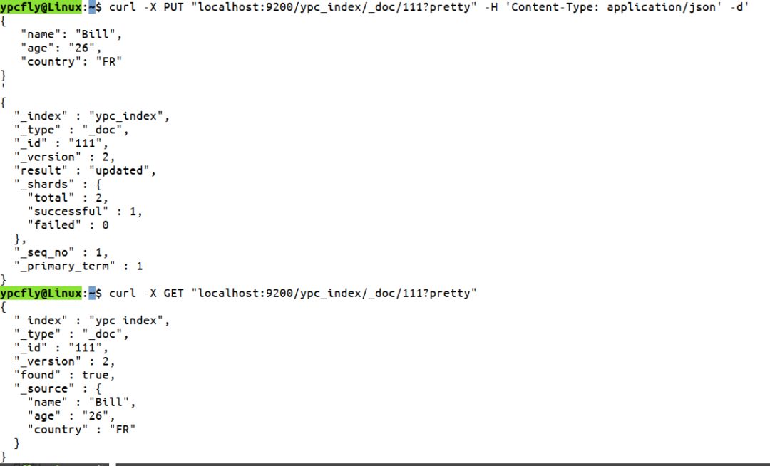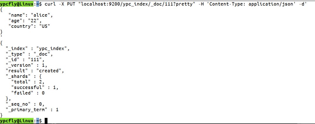curl -X PUT "localhost:9200/ypc_index/_doc/111?pretty" -H 'Content-Type: application/json' -d'