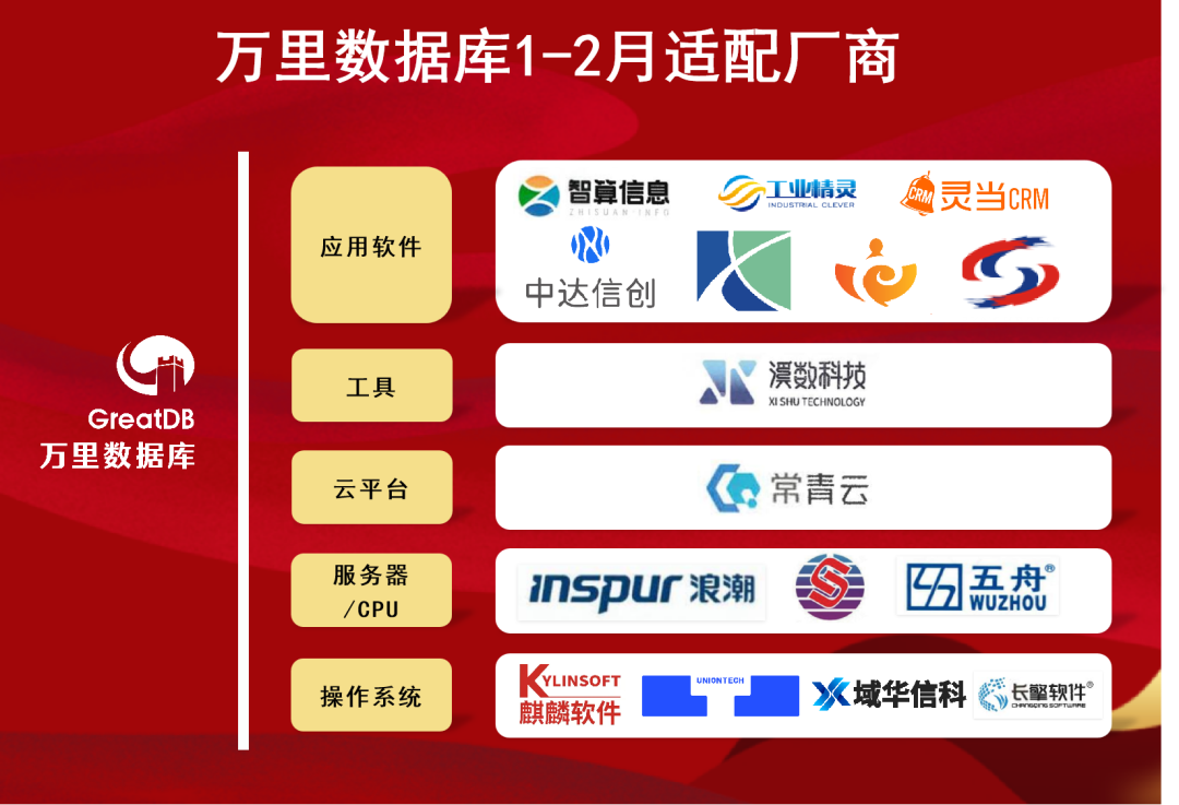 1-2月期间,万里安全数据库软件GreatDB与以下五大领域的生态伙伴完成深度适配,覆盖技术全栈,彰显国产化生态体系的成熟度与包容性: