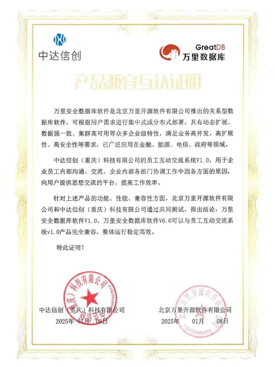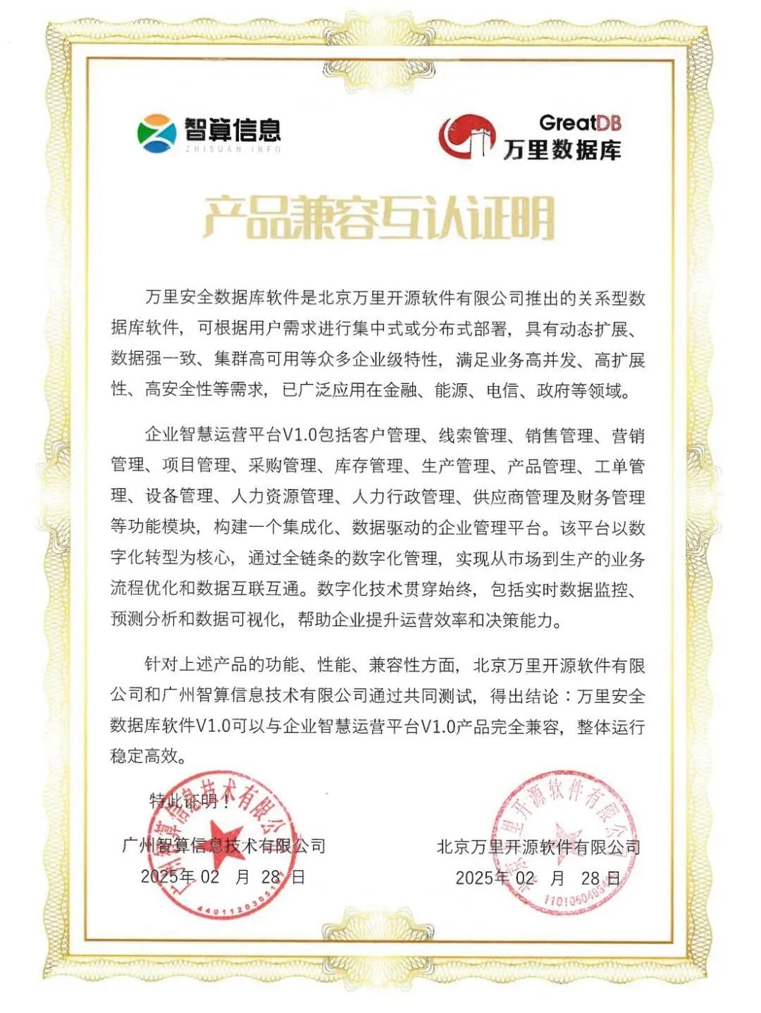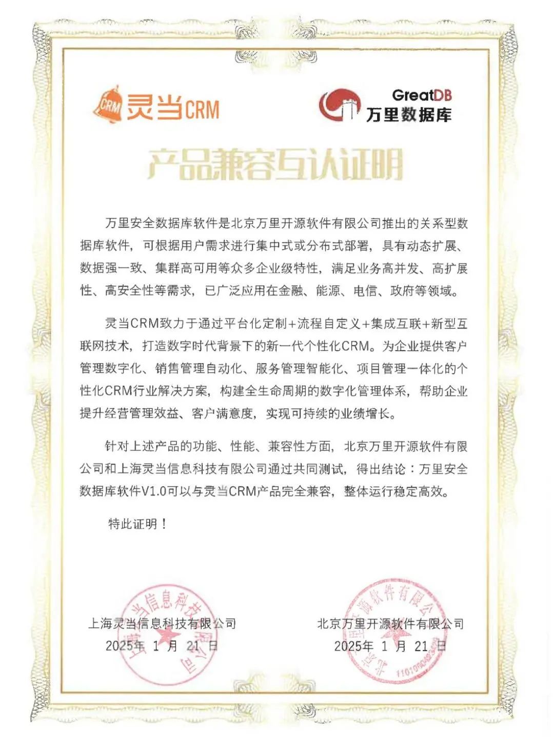 万里数据库与智算信息、昊恩星美、灵当CRM、中达信创、象罔科技、协成致远、西安协同数码在内的7家企业核心业务系统完成兼容认证。测试结果显示,GreatDB与上述企业的ERP、OA、行业垂直应用等系统高度兼容,运行稳定高效,可满足金融、制造、政务等领域对高并发、高可靠性的需求。例如,与灵当CRM系统的平台适配中,GreatDB通过灵活的数据库部署方式,可满足不同应用场景的数据存算需求,助力CRM系统在数字经济时代实现用户的个性化需求与敏捷应用。
