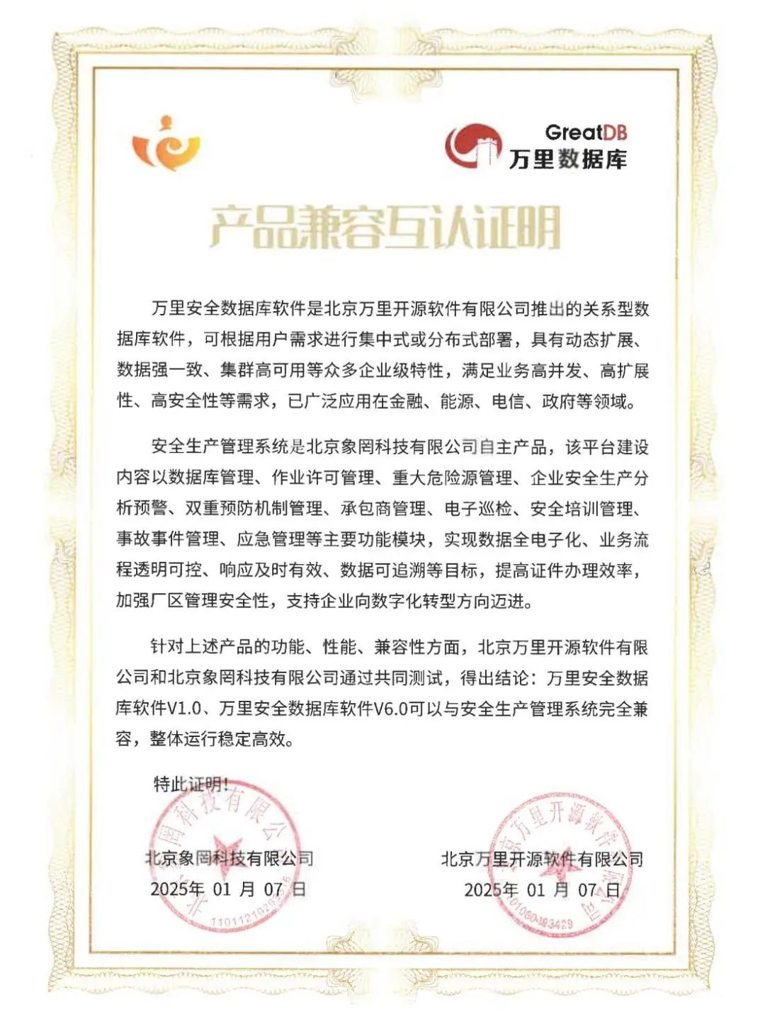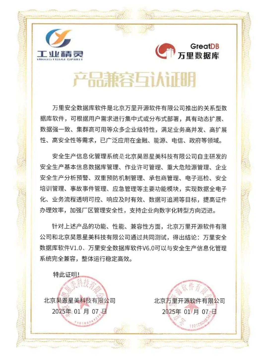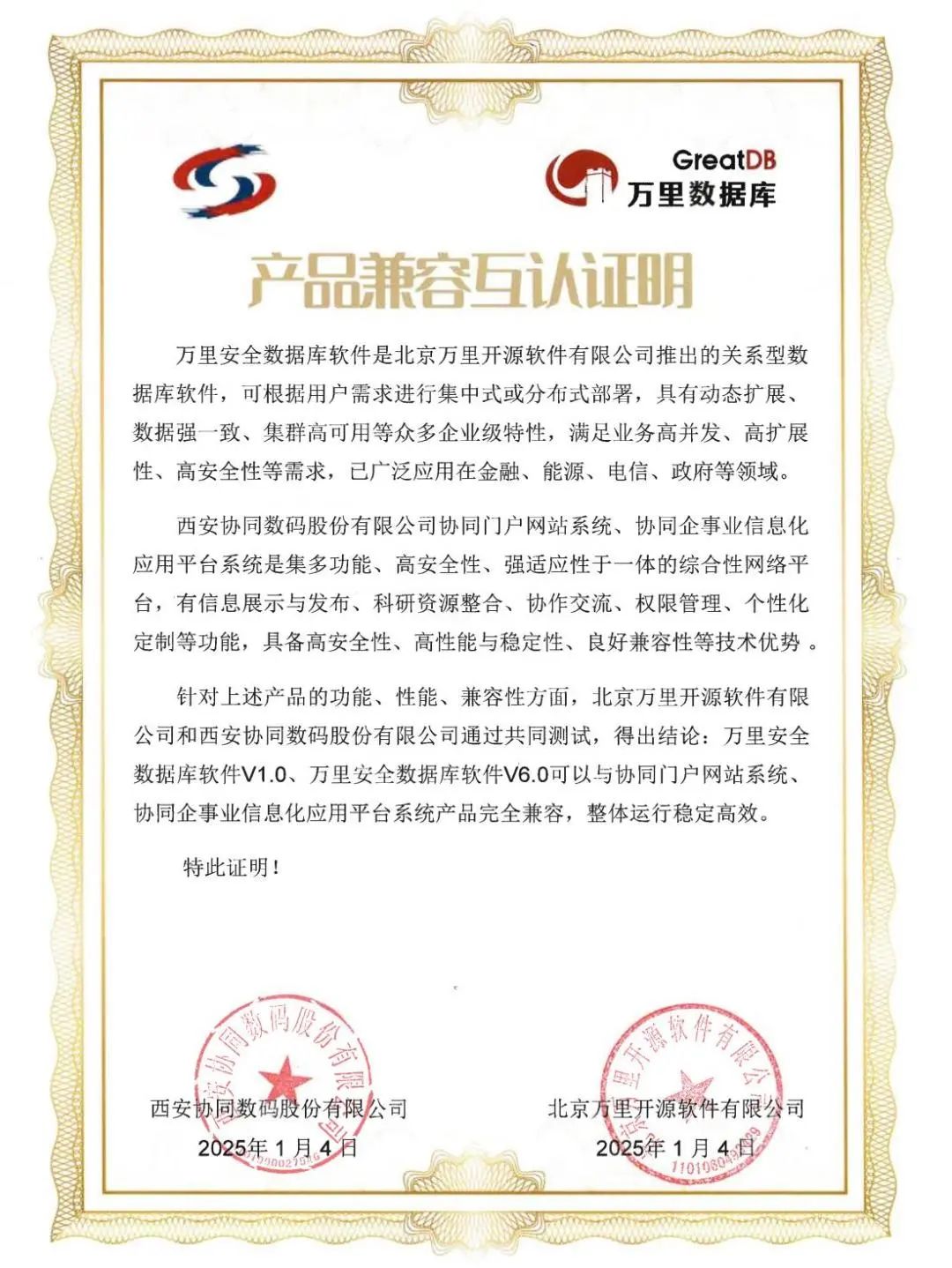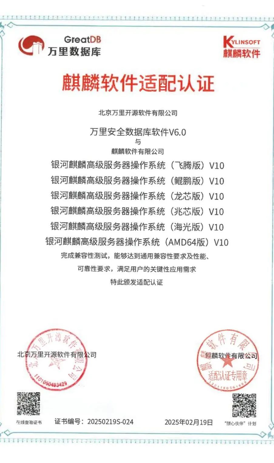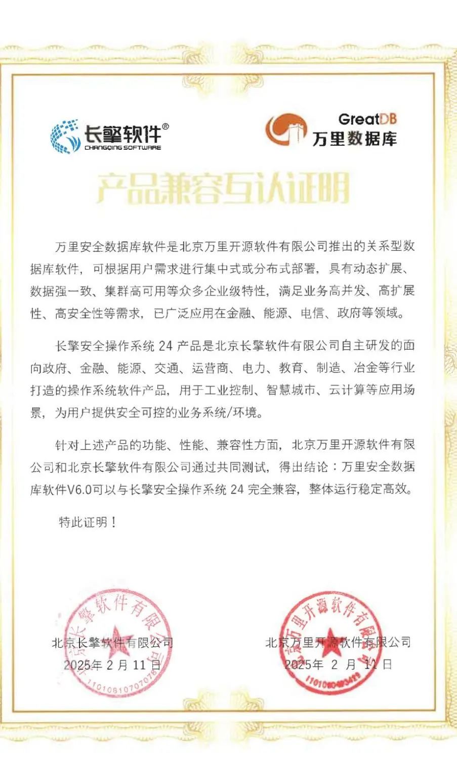 2025开年之际,万里数据库在生态兼容适配领域再结硕果,携手应用软件、工具、云平台、服务器及操作系统等产业链上下游的20余家生态伙伴,共同完成了近60项产品兼容互认证,进一步夯实了国产生态根基,为千行百业数字化转型注入新动能。