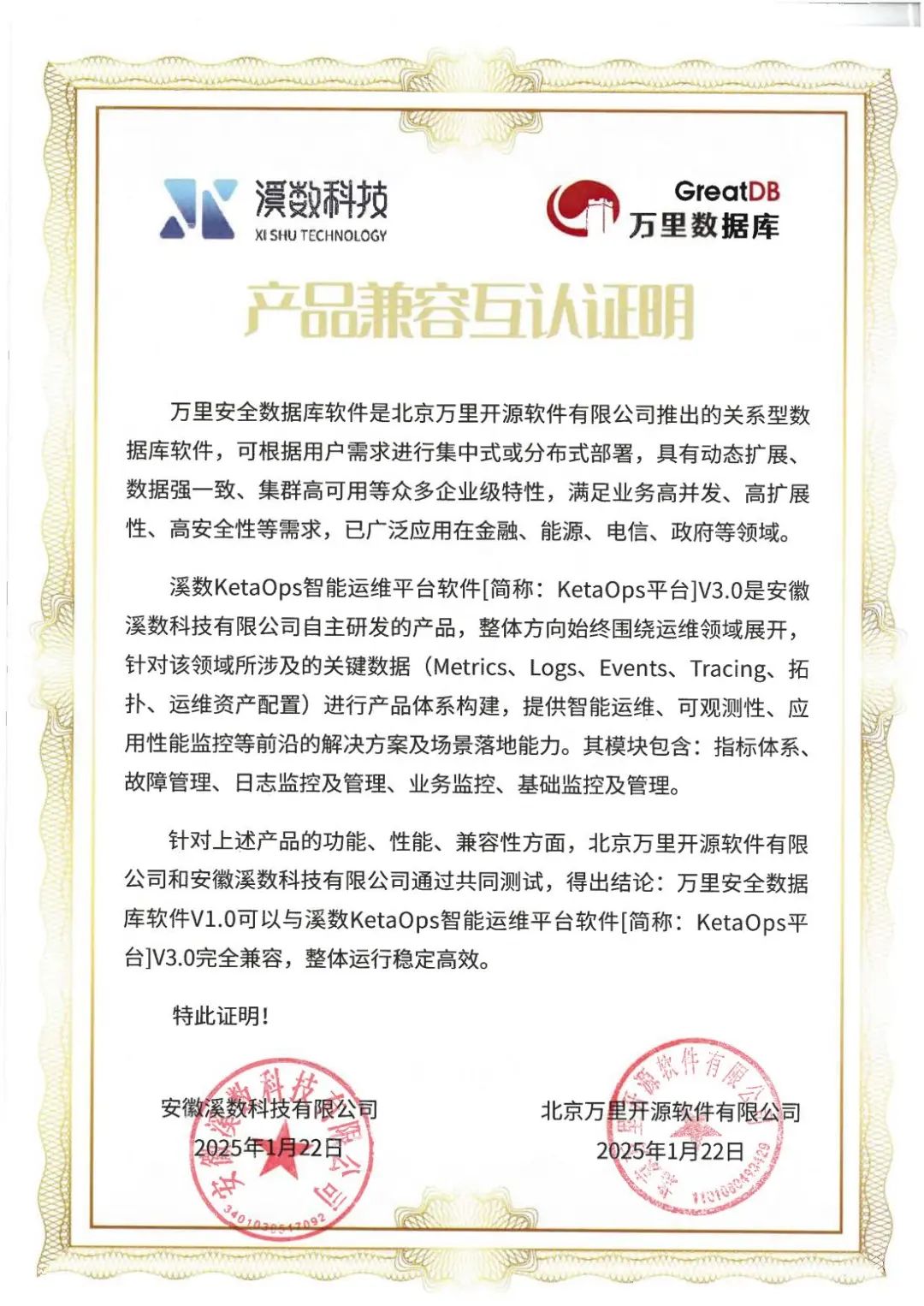 溪数科技的智能运维平台软件与GreatDB完成深度测试。通过适配,双方实现了数据库监控、智能调优、备份恢复等功能的无缝衔接与兼容,可为企业提供从部署到运维的一站式解决方案,显著降低IT运维管理难度。