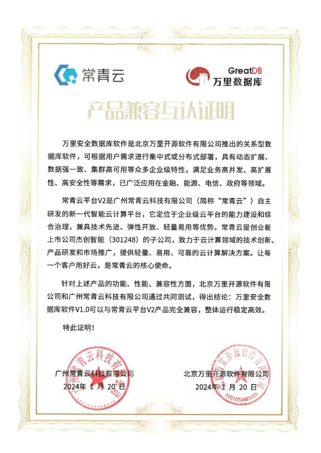 与常青云的智能云计算平台完成适配,标志着GreatDB在云原生领域的进一步突破。该认证验证了GreatDB在容器化部署、弹性扩缩容及多云环境下的稳定性,为金融、能源等重点行业用户提供了“上云用数”的可靠技术底座。