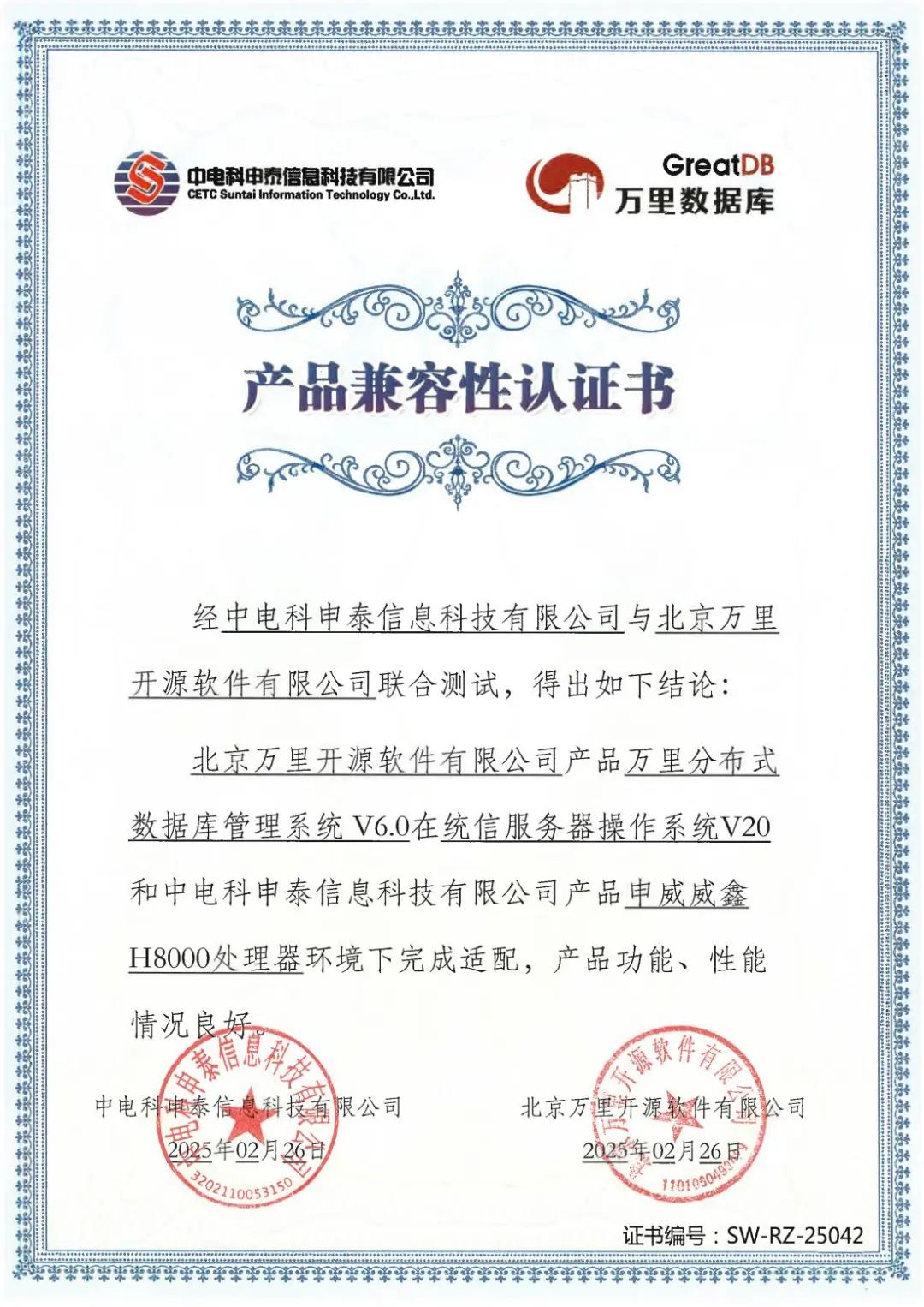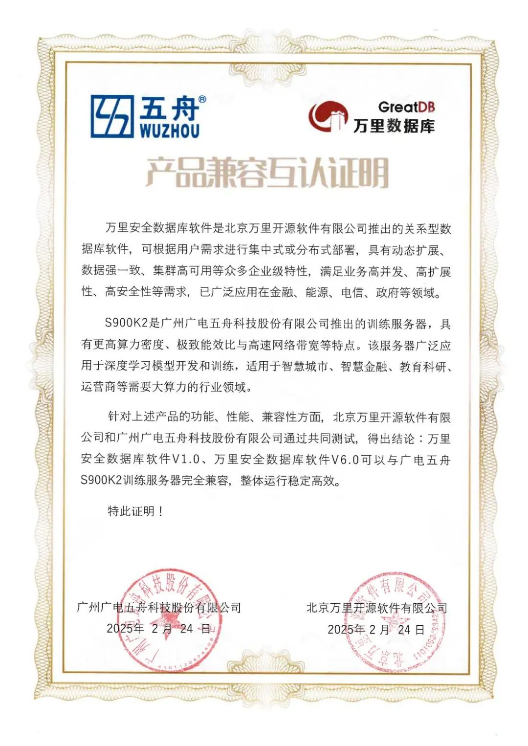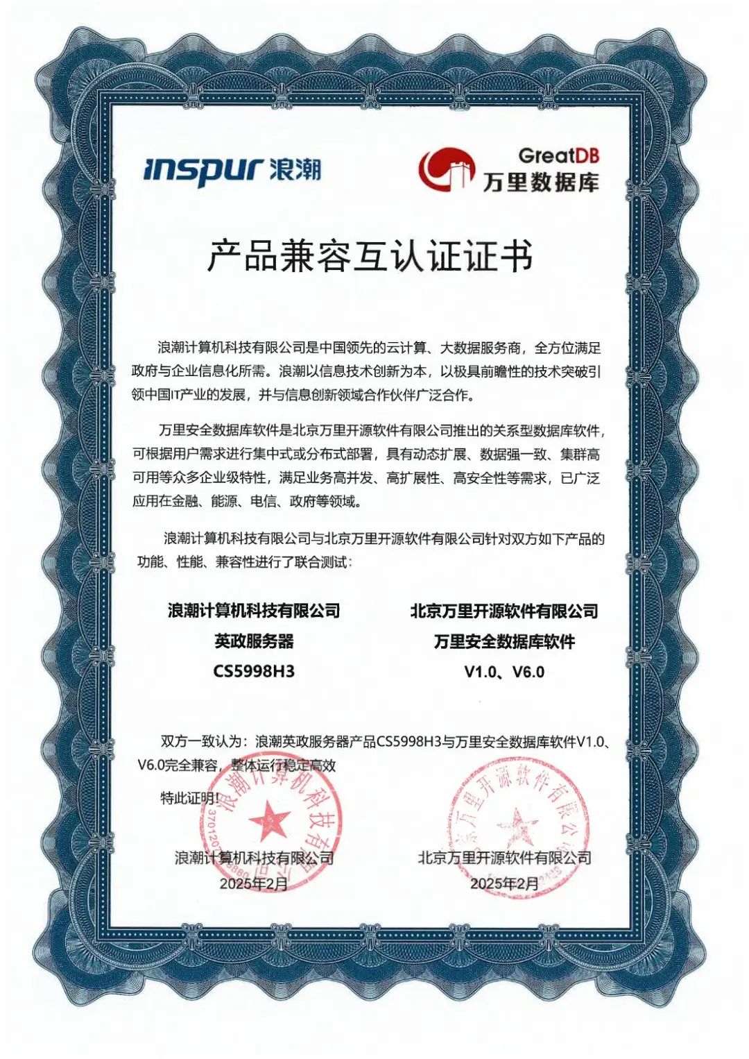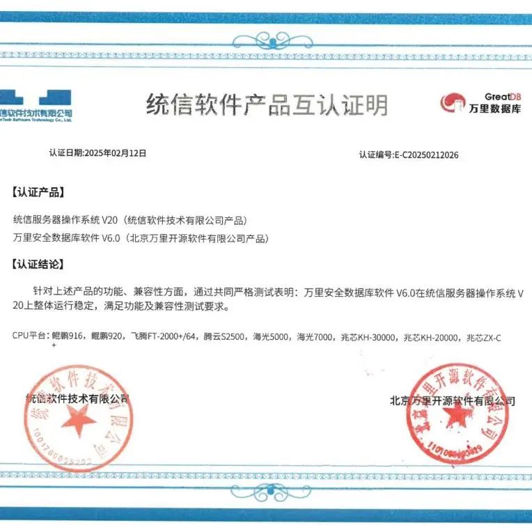 万里安全数据库GreatDB与中电科申泰、浪潮计算机-英政服务器、广电五舟在内的国产服务器/CPU完成全栈适配。