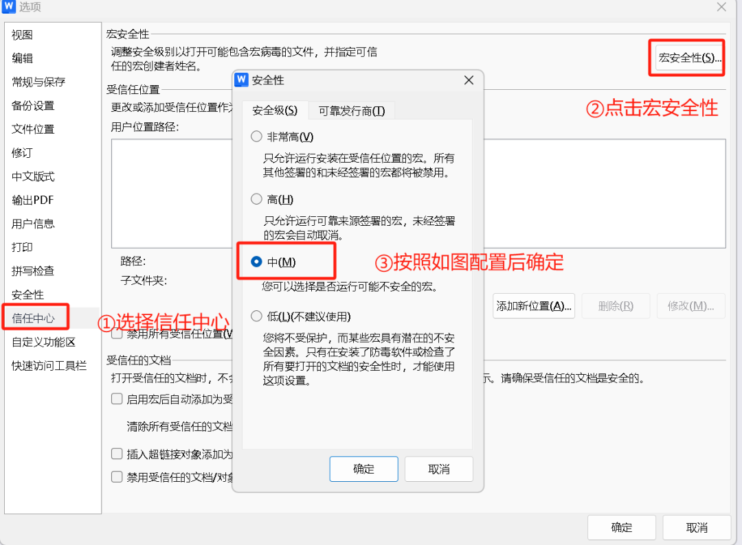 打开word的菜单-文件-选项-设置安全权限,否则无法执行vba脚本