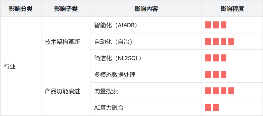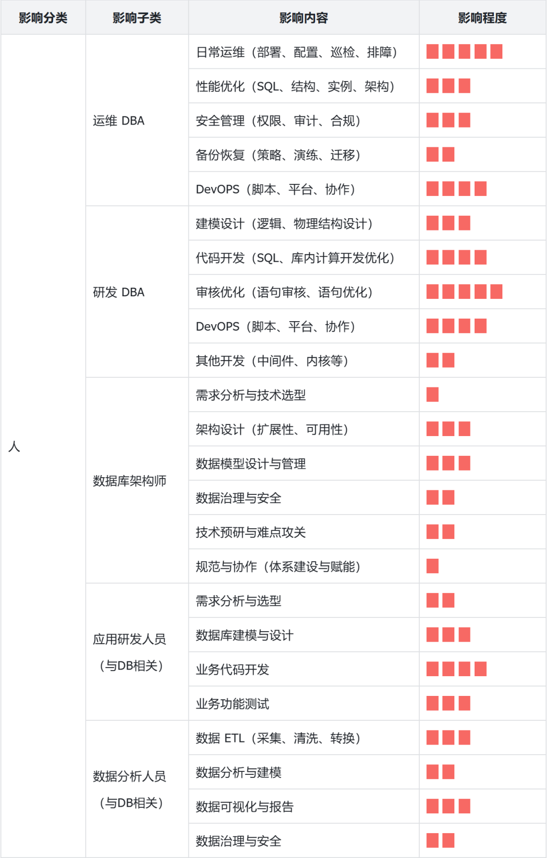 这里根据与数据库有一定关联的人群做了划分,分为运维DBA、研发DBA、数据库架构师、应用开发人员和数据分析人员。不同人员按照其工作职能,做了进一步细分。根据每个细分工作内容,分列受AI的影响程度。整体来看,重复性的(如运维中的巡检)、规则类的(如SQL审核)、逻辑性的(如开发设计类)是AI比较擅长的领域;与之相对应的偏重业务类(如需求分析)、复杂疑难类(如技术攻关)、协作类的(如调研分析)及重要场景(如备份恢复等)相对影响较小。从个人职业发展来看,对初中级职位影响更大,对单一技能岗位影响更大。