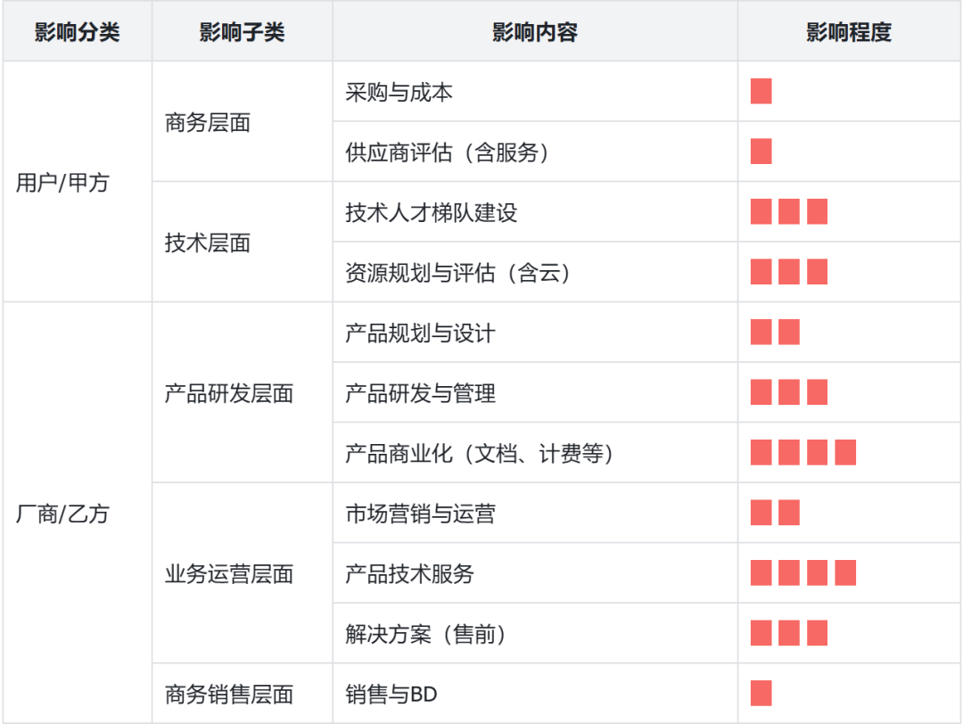 对企业的影响,可分为两个维度,分别是甲方用户和乙方厂商。针对用户而言,主要影响还是在技术层面,AI会对企业人才队伍建设及资源规划评估带来较大影响。特别是前者,企业是否还需要那么多的专业技术人员值得思考?针对厂商来说,AI会对产研、运营等带来更多影响,特别是在针对商业化工作、技服、售前的影响会更明显。总结来看,可以利用一个词来形容对企业的影响,那就是“降本增效”。相对于用户,希望通过AI的引入降低企业使用成本,更好做资源规划;对于厂商来说,则是更多希望通过引入AI提效,加速企业运转效能。