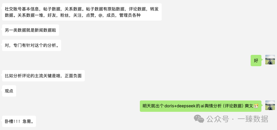 正巧,一位Doris小伙伴:"WX!!! 急需AI舆情分析。"
