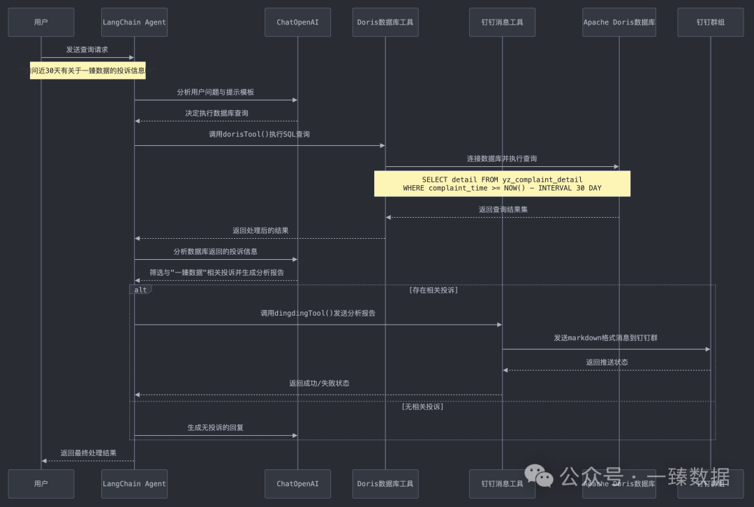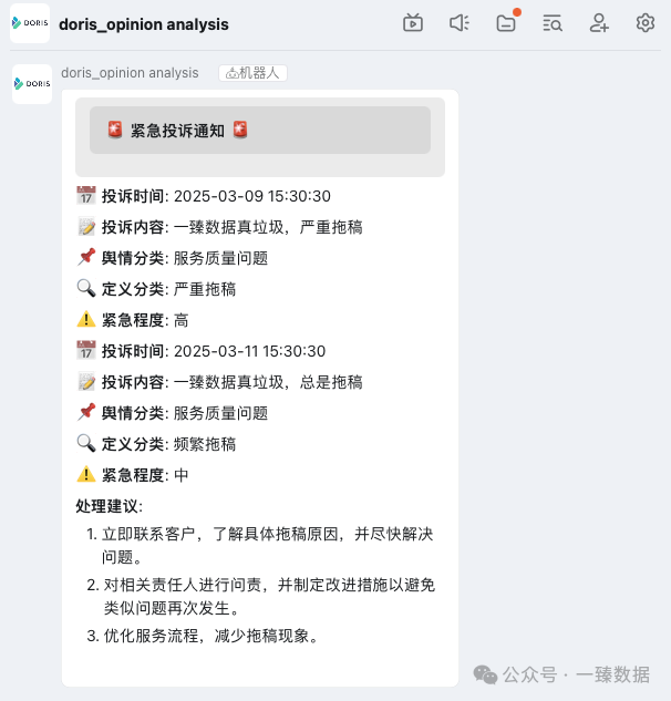 4️⃣ 投诉分析:Agent将Doris查询结果发送给DeepSeek进行分析,DeepSeek筛选出与"一臻数据"相关的投诉,生成分析报告,包括舆情分类、紧急程度