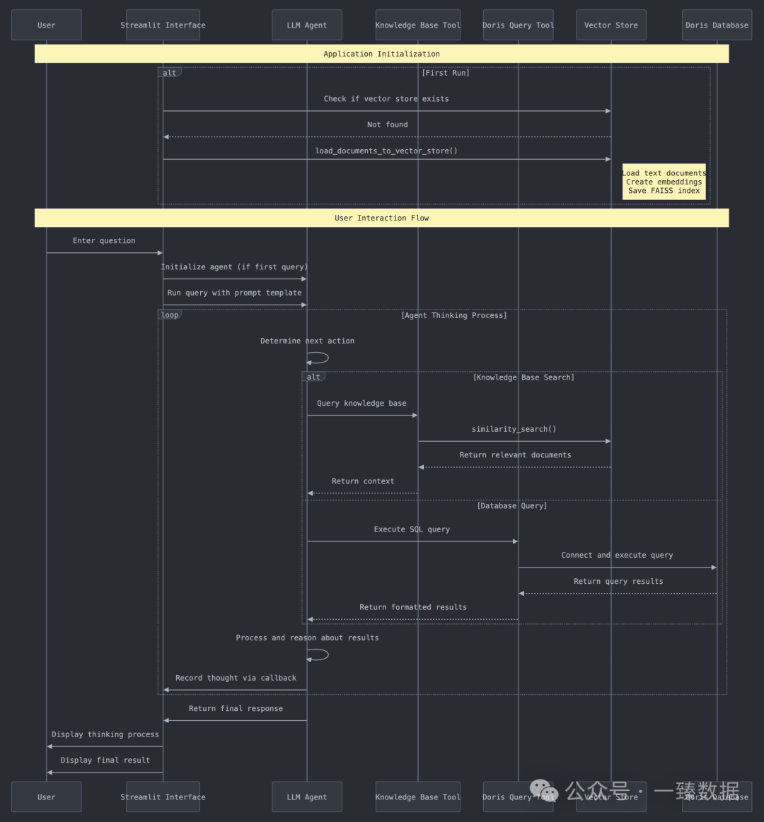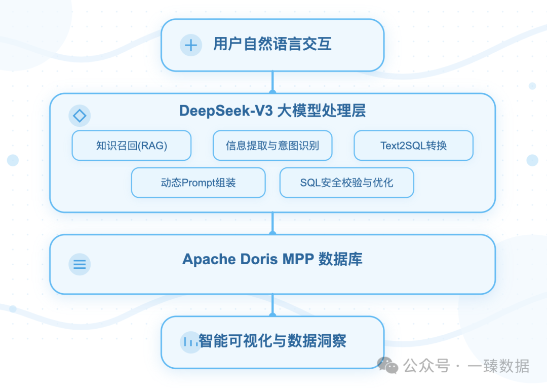 3️⃣ SQL转换:DeepSeek大模型将自然语言转换为标准SQL,安全校验后,查询指令精准送达Doris数据库。