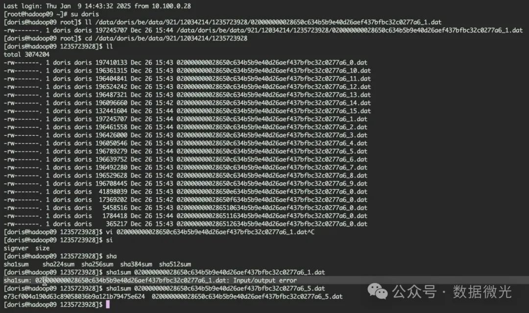 既然 Doris 拥有读取文件的权限,那么问题是否出在文件本身呢?为了验证这一点,我们使用sha1sum