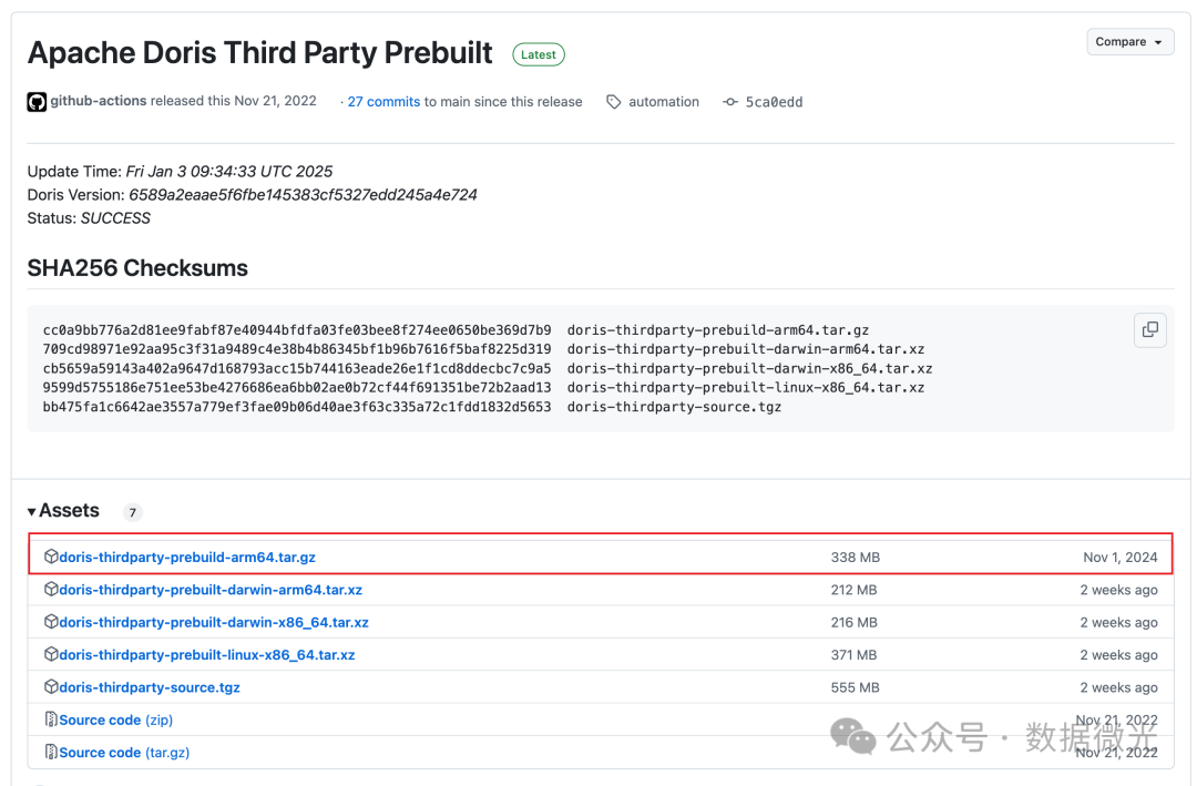 可以在Apache Doris Third Party Prebuilt页面直接下载预编译好的第三方库,省去编译第三方库的过程,参考下面的命令。