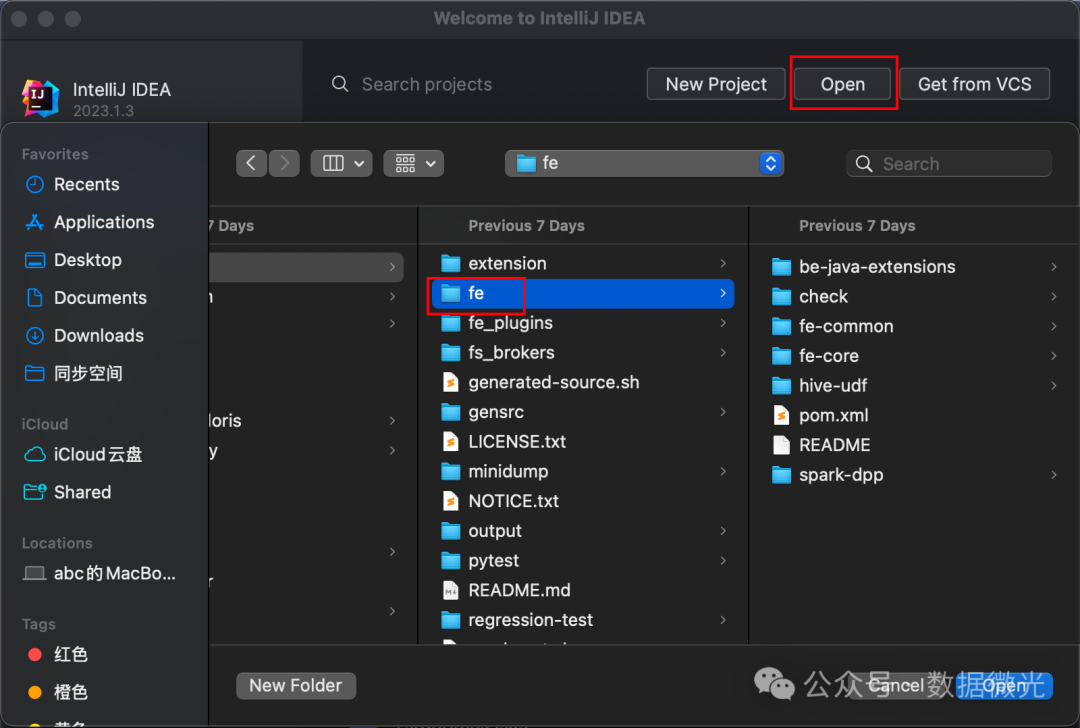 开始用 IDEA 进行 Debug,这里我们不要直接打开Doris项目根目录,要打开 FE 的目录(很重要!!为了不和CLion发生冲突)