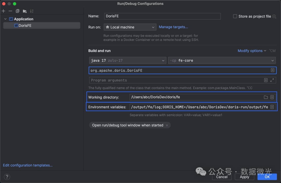 工作目录选择源码目录下的 fe 目录 参照 Doris 代码根目录下的 fe/bin/start_fe.sh 中 export 的环境变量进行环境变量配置。其中环境变量的Doris目录值指向准备工作里里自己copy出来的目录。