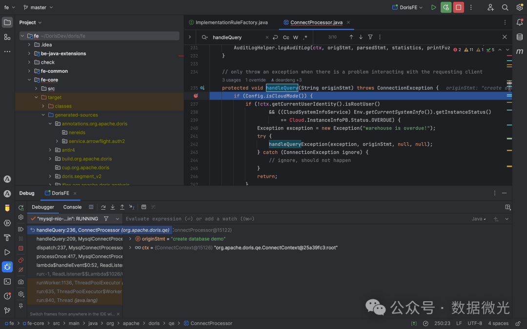 在 handleQuery 处打上断点,此时去执行query语句,会自动跳转到断点处,接下来就可以开始愉快的 Debug之旅了,比如在上上期讲的Doris 语法迁移任务,就可以用Debug来不断调试自己的代码啦!