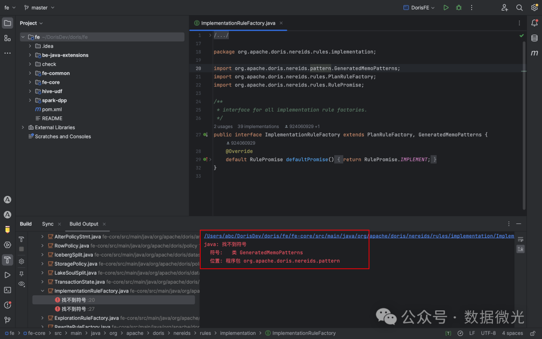 Q4 IDEA启动FE报错:java: 找不到符号 符号: 类 GeneratedMemoPatterns 位置: 程序包 org.apache.doris.nereids.pattern
