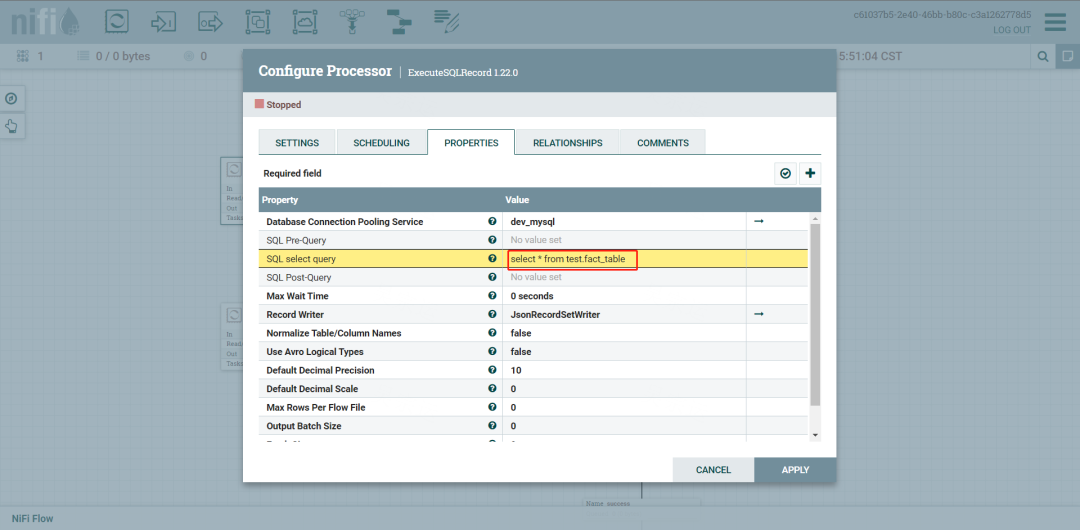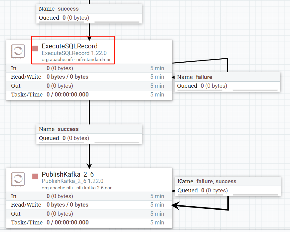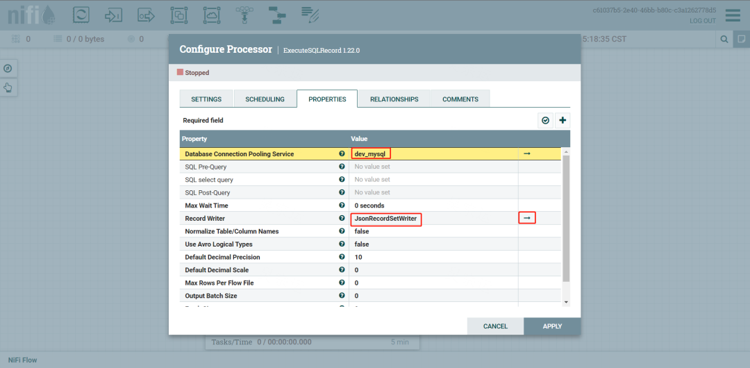 2. 设置ExecteSQLRecord,用来将数据转成json