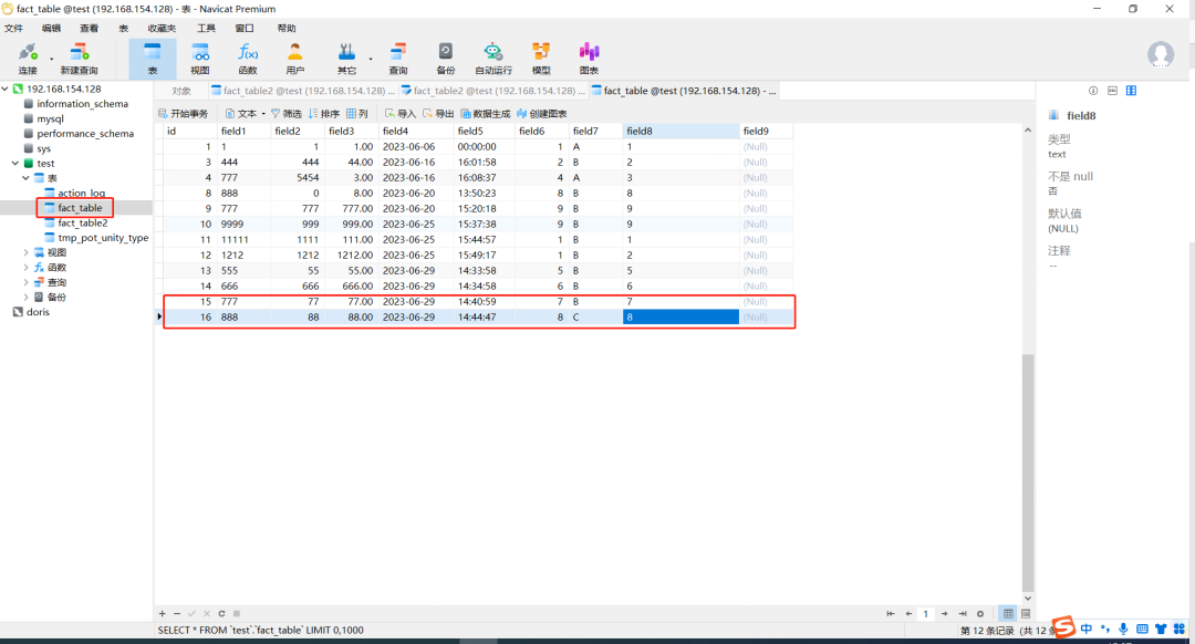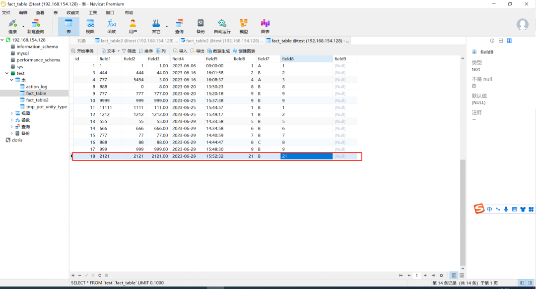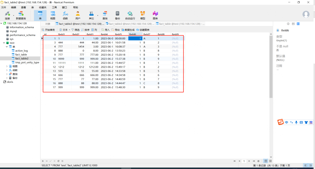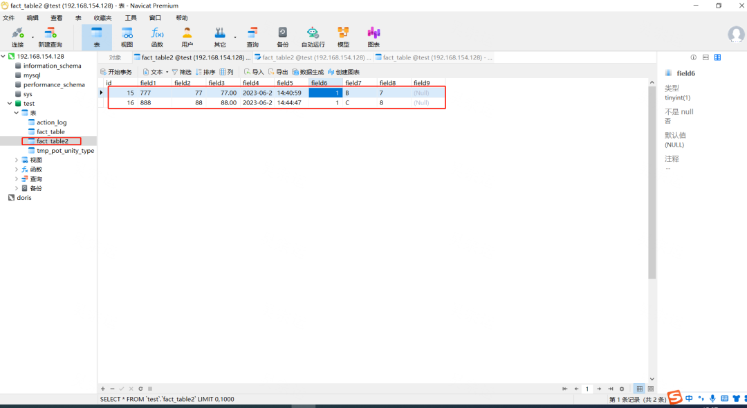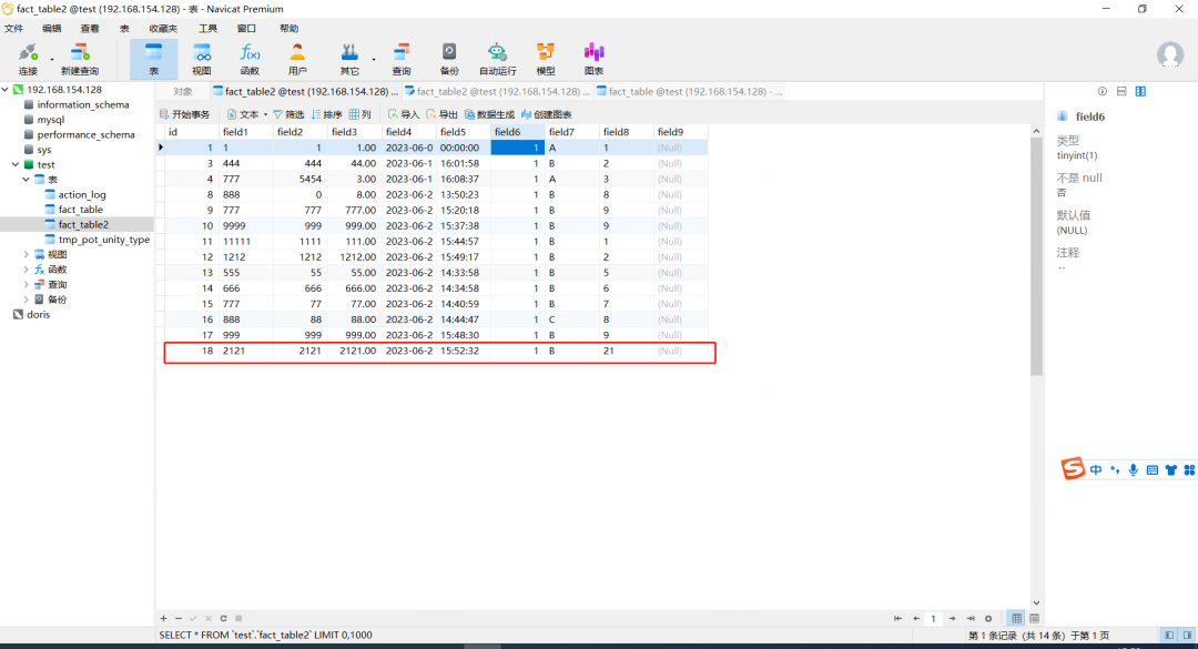 -- test.fact_table2 definitionCREATE TABLE `fact_table2` (`id` int NOT NULL AUTO_INCREMENT,`field1` varchar(255) DEFAULT NULL,`field2` int DEFAULT NULL,`field3` decimal(10,2) DEFAULT NULL,`field4` date DEFAULT NULL,`field5` time DEFAULT NULL,`field6` tinyint(1) DEFAULT NULL,`field7` enum('A','B','C') DEFAULT NULL,`field8` text,`field9` blob,PRIMARY KEY (`id`)) ENGINE=InnoDB AUTO_INCREMENT=20 DEFAULT CHARSET=utf8mb4 COLLATE=utf8mb4_0900_ai_ci;