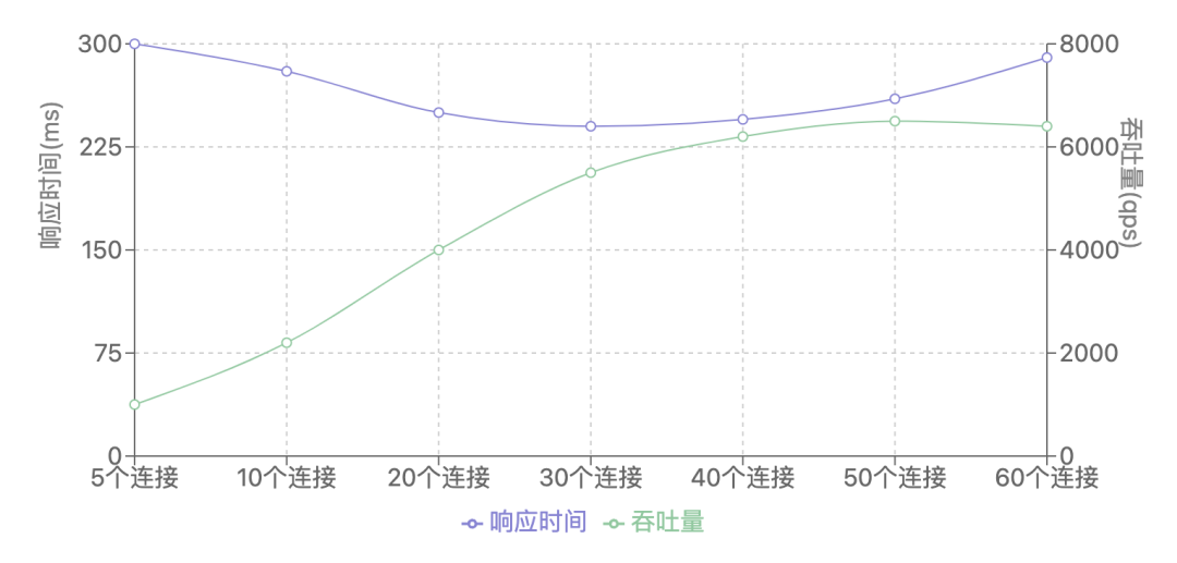 "看这个曲线,"我指着图表解释道,"连接数并不是越多越好。当连接数达到30-40个时,系统达到最佳平衡点。超过这个数值,响应时间反而会上升。"