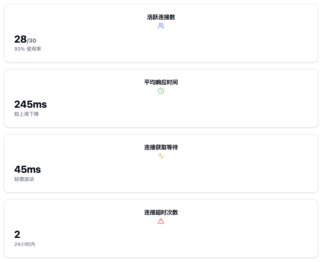 "看这些指标,"我指着监控面板,"活跃连接数、响应时间、等待时间和超时次数,这些都是衡量连接池健康状态的关键指标。"