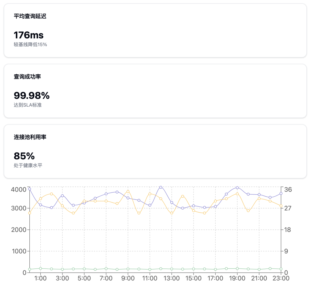 "优化后的效果显著。"我指着性能曲线,"查询延迟降低了15%,连接池利用率维持在健康水平。"