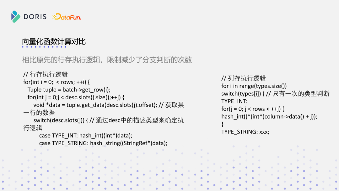 现有的Doris执行引擎中,内存结构如左侧图示所示,采用了一个名为RowBatch的结构来表示数据。在这个结构中,数据是通过一个个Tuple组织起来的,每个Tuple占据一块连续的内存空间。尽管RowBatch可以包含多行数据,但在内部处理时,这些数据依然是按照行的方式进行处理的。例如,图中左侧的RowBatch结构虽然显示为三列,但每行数据在内存中是连续存储的,处理时也是逐行进行。相比之下,新的内存结构被称为Block,其中的数据是以列的形式存储的。在Block中,每一列数据构成了一个连续的内存块。这意味着,现有的Doris执行引擎是基于RowBatch和Tuple实现的,而新的向量化引擎则将转变为基于Block和Column的实现方式。这种转变有助于更好地支持向量化计算,提高数据处理的效率。如图所示,现有的Block结构原本只包含两列,即a列和b列,这两列数据在内存中是以列的形式连续存储的。abs是一个计算函数,其处理流程如下:从原始的Block中读取数据,将其分为a列和b列。接着,仅对b列执行abs计算。在传统的行式存储模式下,即使a列的数据与计算无关,由于行式存储的特点,a列仍会参与到整个处理过程中,因为每行数据在内存中是连续存储的。然而,在向量化函数执行框架中,情况有所不同。a列的内存不会无谓地参与计算过程,因为它与b列在内存结构上已经分离。具体来说,当对b列应用abs函数后,会产生一个新的列——abs(b)。在此过程中,a列完全不受影响,没有发生任何内存上的交互。如右侧的图所示,完成abs计算后,会在原有Block的基础上生成一个新的连续内存区域,该区域包含新产生的abs(b)列。最后,将原始的b列移除,这样最终的Block就只剩下a列和abs(b)列,从而实现了列式存储下的向量化计算。从上图可以看出,向量化函数计算相较于传统函数执行逻辑,为何能提升性能。左侧展示的是传统函数执行的逻辑:当一个batch的数据输入时,需要逐行遍历,针对每一行数据,通过其slot来确定该行数据中的偏移量,以此获取特定列的数据。接下来,基于这一列数据,每次都需要进行类型判断,以决定调用哪个具体的函数来进行处理。例如,如果数据类型是整数(int),则调用整数的哈希函数;如果是字符串(string),则调用字符串的哈希函数。相比之下,右侧展示了列式存储下的执行逻辑,显得更为简洁高效。在处理整个Block的过程中,类型判断仅需执行一次。假设一个row batch或Block含有1024行数据,使用行式存储的执行逻辑,类型判断就需要重复1024次;而采用列式存储,只需执行一次类型判断。此外,还有一个隐含的优势:由于列式存储的数据是连续的,因此在处理连续的内存块时,可以更好地利用缓存(Cache),提高数据访问的速度和效率。- Cache亲和度高:由于列式计算的数据是按列组织的,这使得数据更容易命中缓存。例如,在上述的abs(b)计算示例中,列式计算过程中,除了目标列b外,其他不相关的列不会参与到计算中来。加之列式数据在内存中是连续存储的,进一步增强了Cache命中率,提升了数据访问效率。