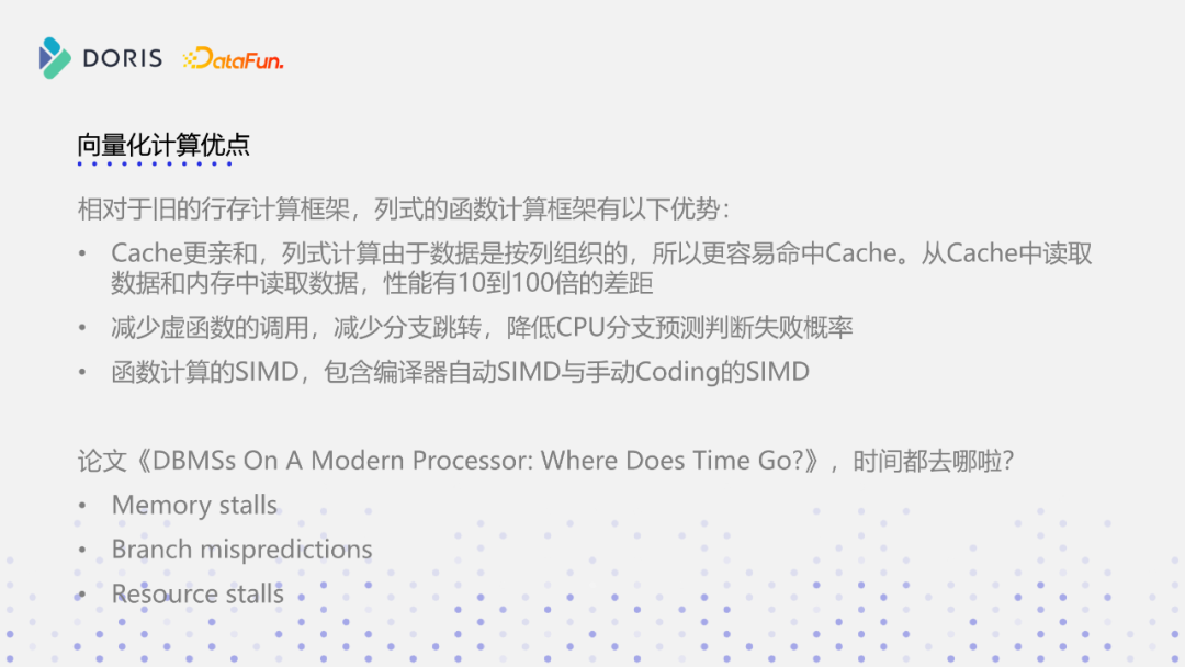 说到Doris,向量化技术是绕不开的话题,本文从CPU向量化原理出发,通过Cache、虚函数、SIMD等方面讨论Doris如何做的性能优化。从字面上看,向量化是指将原本逐一处理单个数值的运算,转变为同时处理多个数值集合的运算过程。我们可以通过多种视角来探讨这一概念。